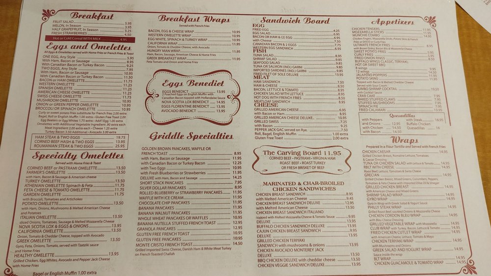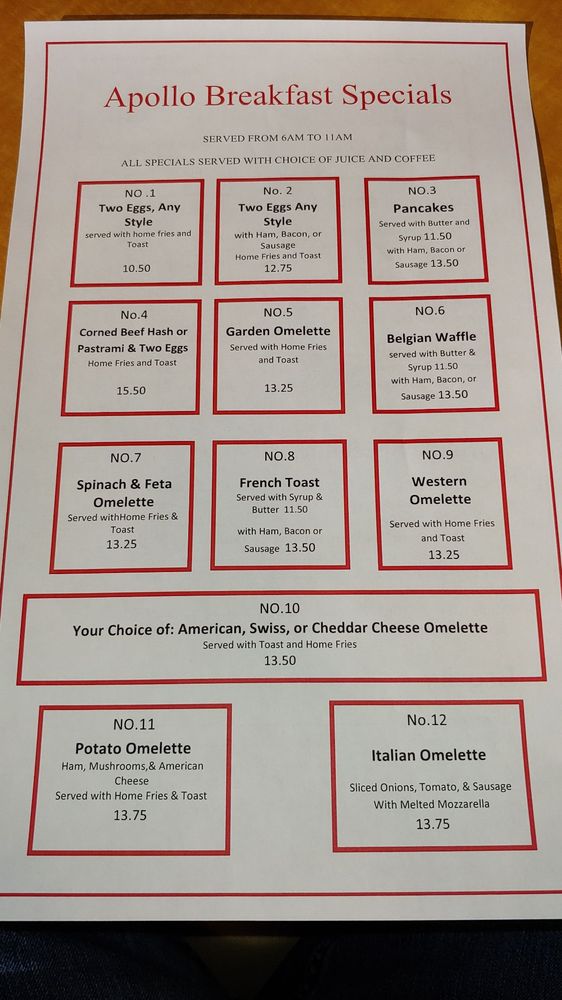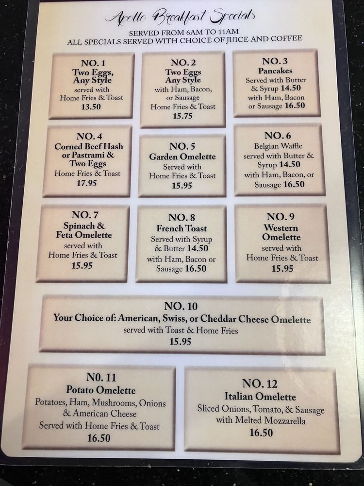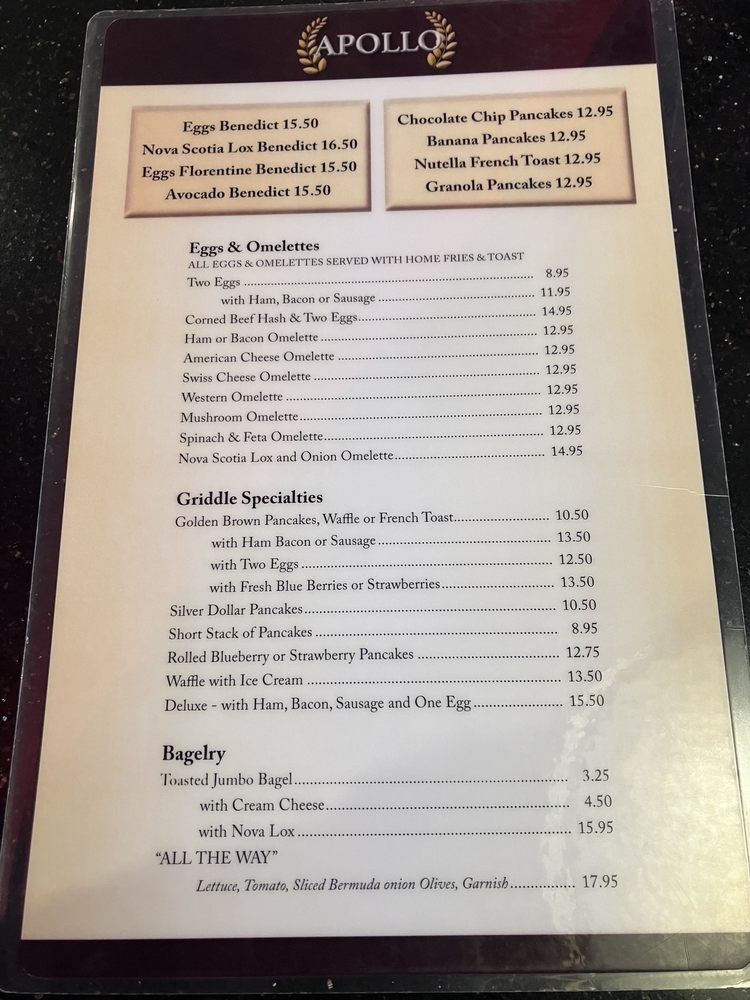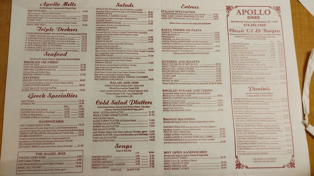 Introducing the Apollo Diner, a bustling diner located at 630 Merrick Ave in East Meadow, NY. This diner offers a range of options such as Greek pizza, Chinese roast pork, and classic breakfast dishes like omelettes and eggs benedict. Customers rave about the generous portions, friendly service, and overall dining experience. With vegan and vegetarian options available, Apollo Diner caters to a diverse range of tastes. The atmosphere is casual, perfect for families or groups. From the delicious Nutella Pancakes to the Avocado Benedict, each dish is prepared with care and served promptly. Don't miss out on the French Onion Soup or the Lox Benedict - they are must-try items on the menu. Explore the expansive menu, enjoy the laid-back vibe, and savor the flavors at Apollo Diner.